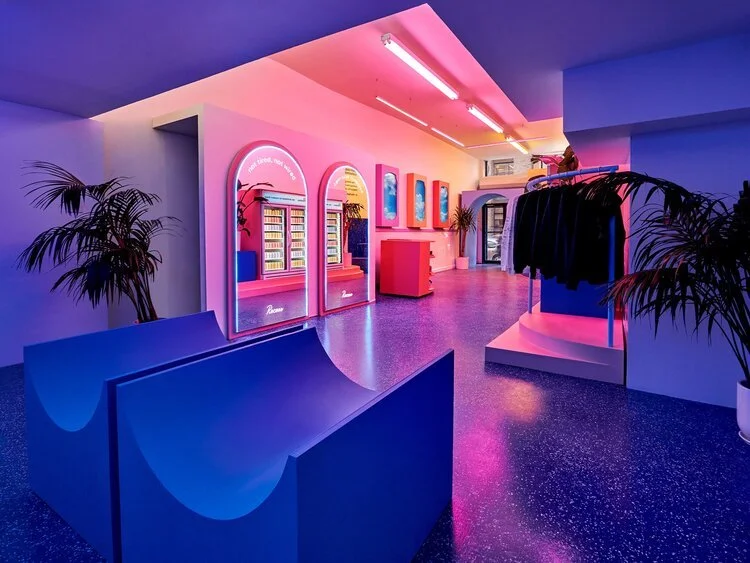 The pop-up shop was designed to exist as a community hub with mood changing-lighting, mirrored walls, stadium-style seating and digital discovery screens.
